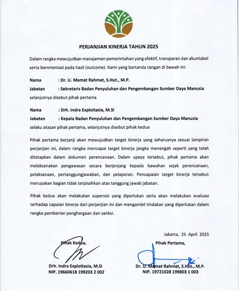 JAKARTA, 19 September 2025 – Badan Penyuluhan dan Pengembangan Sumber Daya Manusia (BP2SDM) Kementerian Kehutanan imenetapkan Tim Efektif Transformasi Organisasi melalui Surat Keputusan Kepala Badan P2SDM. Tim ini dibentuk untuk mempercepat perwujudan transformasi BP2SDM dari supporting system menjadi core system dalam pembangunan sumber daya manusia kehutanan. Penetapan tim ini diikuti dengan penyusunan rencana kerja yang berfokus pada empat pilar strategis…